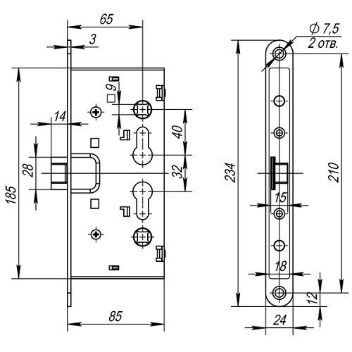 Повышенный ресурс работы: 600 000 циклов открывания/закрывания. Межосевое расстояние: 72 мм. Бэксет: 65 мм. Вылет ригеля: 22 мм. Ширина лицевой планки: 24 мм. В комплекте крепеж, винт для евроцилиндра 75 мм.