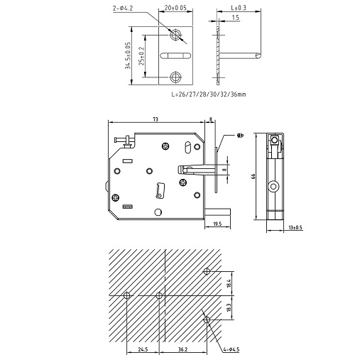 Замок отличается простотой установки: предусмотрены крепежные отверстия на корпусе, а отдельная ответная планка обеспечивает точное совмещение с дверцей.