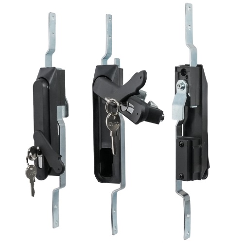 Замок мебельный щитовой с пластиковой ручкой . Устанавливаются на металлические шкафы. Благодаря ручке-трансформеру, которая компактно укладывается в закрытом режиме, замок выглядит эстетично и аккуратно. А дополнительная защитная пластина предотвращает попаданию загрязнений в замочную скважину. Фиксация выполняется в одной точке запирания, а также у данной модели предусмотрены механизм для установки дополнительных тяг. Таким образом, замок выполняет фиксацию в одной точке - при запирании только ригелем, двухточечную фиксацию - при запирании только тягами (сверху и снизу) и комплексную - в 3-х местах (ригель + 2 тяги). У данной модели тип замка Мастер, для каждого замка предназначена пара ключей, которыми можно открыть все замки этой серии.