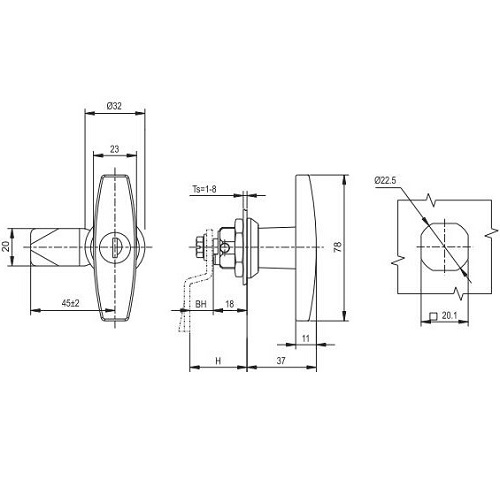 Щитовой замок серии 3020-2 со встроенной ручкой. Имеет два уплотнительных резиновых кольца, внутреннее и внешнее. Внешнее резиновое уплотнительное кольцо, позволяет замку плотно прилегать к поверхности дверцы. Внутреннее уплотнительное кольцо не позволяет пыли и влаге проникать внутрь. Степень защиты замка IP66.