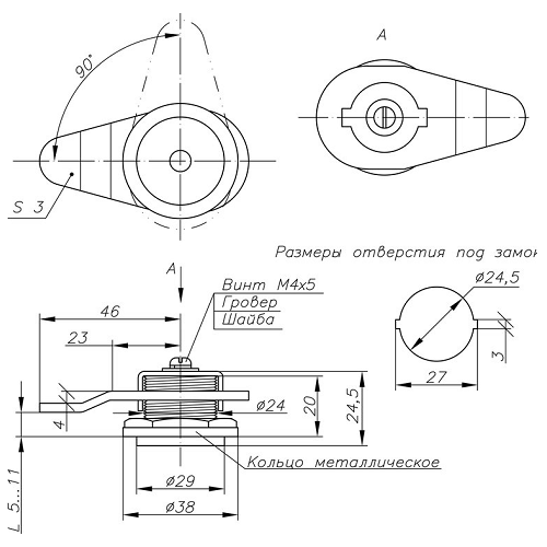 Толщина запорной планки -3 мм, изгиб планки -7 мм. Диаметр посадочный -24,5 мм. Габаритный диам. - 30х69х26 мм.