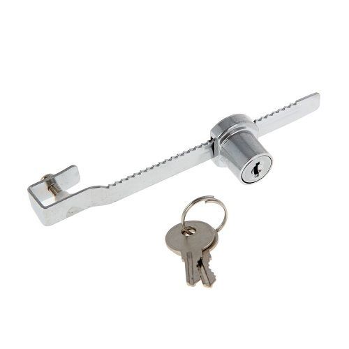 Накладной замок для стеклянных раздвижных дверей ("замок-крокодил"). Комплектация: замок, зубчатая планка 140мм, 2 ключа. Планка прочно крепится к стеклянной дверце с помощью зажимов. На планку надевают замок, в который упирается вторая дверь и не может двигаться. В закрытом состоянии замок фиксируется на планке, и его невозможно снять. Поворотом ключа замок отпирается и легко снимается с планки, которая сама по себе не мешает движению дверей.