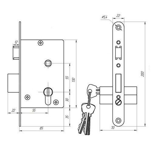 Характеристики: Бренд - ДААЗ, Тип - Замок, Вид замка - Врезной, Тип защелки - металлическая, Кол-во ригелей - 1, Тип ригелей - Прямоугольный, Тип механизма - Цилиндровый, Тип ключа - английский, Кол-во ключей - 4 шт, Дорнмасс/Бэксет - 55 мм, Межосевое расстояние - 55 мм, Материал - Сталь, Цвет - Хром.