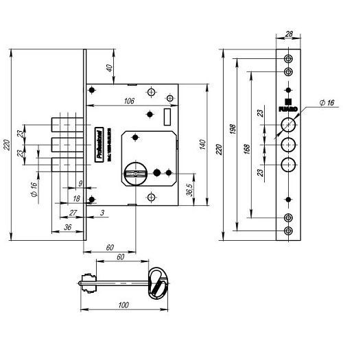 Замок врезной Fuaro (Фуаро) сувальдный V25/S-60.00.3R16, 4 кл. с тремя ригелями предназначен для установки во входные металлические двери. Стальной оцинкованный корпус. Закаленная пластина от высверливания. Универсальная установка, подходит для левых и правых дверей. Бэксет- 60мм. Выход ригелей- 36мм. Открывание-4 полуоборота. Диаметр ригелей -16мм. В комплект входят: 4 ключа с эргономичной пластиковой головкой для дверей толщиной 40-120мм, крепежная фурнитура.