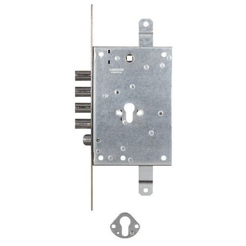 Корпус врезного замка 85.971 S с тремя точками запирания для цилиндрового механизма с защелкой предназначен для левосторонних дверей. Реверсивная защелка диаметром 20 мм приводится действием цилиндром и фалевой ручкой. Бэксет 66 мм. Ход 4 круглых ригелей диаметром 18 мм. Вылет ригелей - 30 мм. Межосевое расстояние 85 мм. Ход тяг 20 мм.