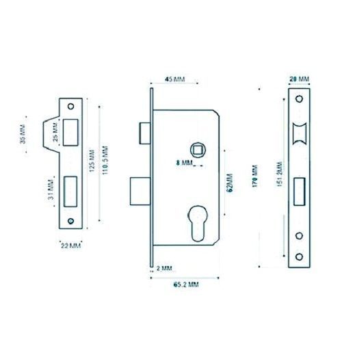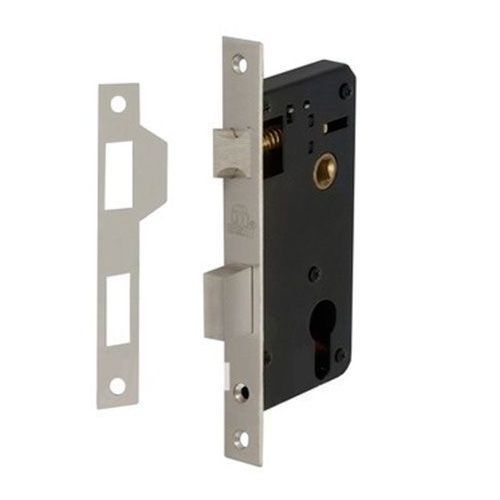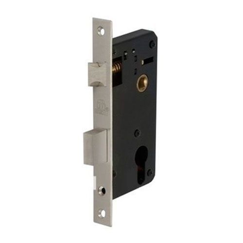 Цилиндровый замок с защелкой, универсальный (защелка переворачивается при вдавливании в корпус и поднятии флажка), с ответной планкой. Защелка открывается от ключа и ручек. Межосевое расстояние 62 мм, бексет - 45 мм. Цилиндр и ручки в комплект не входят.