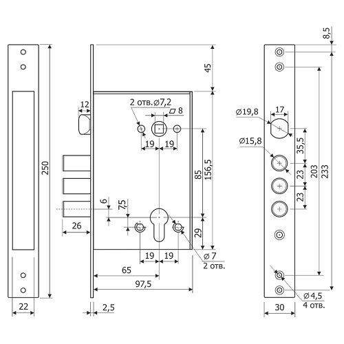 Корпус врезного Guardian (Гардиан) замка с защёлкой ЗВ 32.21 /123:114/ - Замок врезной цилиндровый под ручку. Реверсивная защелка, переворот защелки осуществляется без разбора замка. 4 класс взломостойкости. Возможность установки броненакладки на цилиндровый механизм. Замок предназначен для установки в металлические и деревянные двери, шкафы и сейфы.