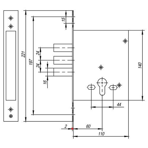 Корпус замка Cisa 56.436  Blockator - экономичный вариант цилиндрового замка для стальных дверей (производитель Италия). Оцинкованный корпус замка выдерживает 240 часов в соляном тумане. Замок имеет съемную планку, 3 стальных ригеля диаметром 16 мм (вылет ригеля 36,5 мм), отверстия для монтажа броненакладки, пластину типа «шеврон» для защиты внутренних механизмов замка. Класс безопасности 4. Гарантия 2 года.
