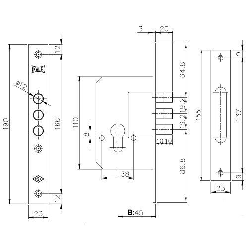 Корпус замка 3 ригеля . Расстояние от планки до центра цилиндра 45мм.