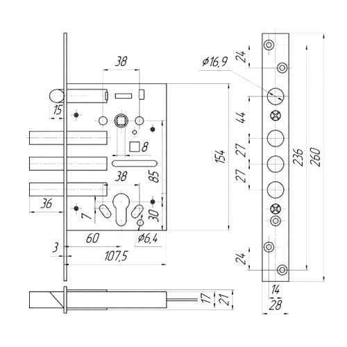Корпус замка ЗВ-7РМ-006-Хп предназначен для различных типов дверей толщиной не менее 30 мм и сертифицированы по 4-му классу при использовании стандартного цилиндрового механизма секретности "KALE" с ключами "перфокарта" и броненакладкой. Корпус замка снабжен засовом, состоящим из 3-х ригелей диаметром 16,8 мм и универсальной защелкой. Вылет засова 36 мм при трех полных оборотах ключа. Угол поворота ручки привода защелки через шток квадратного сечения 8x8 мм составляет 32 градуса. Цвет: хром.