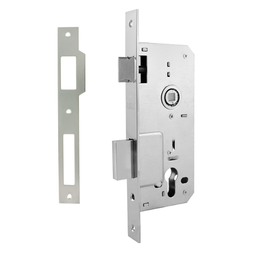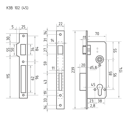 Описание: Корпус замка под цилиндр, плоский ригель Универсальный, защелка легко переставляется. Габариты: 70х174мм, лиц. планка - 239мм (ширина 22мм), Удаление ключевого отверстия - 45 мм (до лицевой планки толщиной 2.8мм). Межосевое расстояние (ключ-ручка) - 85 мм.