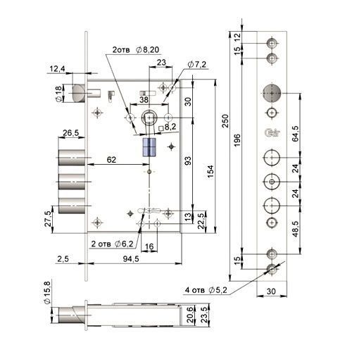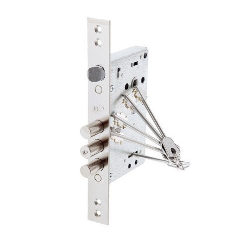 Замок врезной сувальдный универсальный с тремя цилиндрическими ригелями диаметром 15,8 мм и защелкой класс 3 ГОСТ 5089-2011, предназначен для установки на левые и правые металлические двери, как внутреннего, так и наружного открывания.