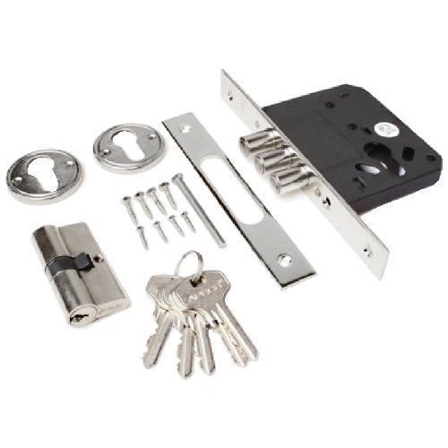 Дверной замок Апекс, в комплекте с ответной планкой, цилиндровым механизмом с ключами, накладки и крепеж.