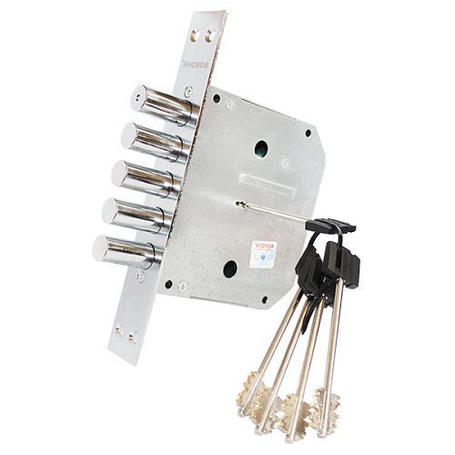 Замок врезной сувальдный K8-6 сертифицирован согласно 4 классу безопасности. Предназначен для установки в металлические двери. Все детали выполнены из высокопрочной стали, что позволяет использовать замок в противопожарных дверях. Обладает высокой секретностью - более 250 000 вариаций. Имеет засов из пяти мощных цилиндрических штырей. В одном из штырей запрессован закаленный стержень - защита от перепиливания. Ослабленные зубья на пластине засова служат защитой от взлома «свертышем».