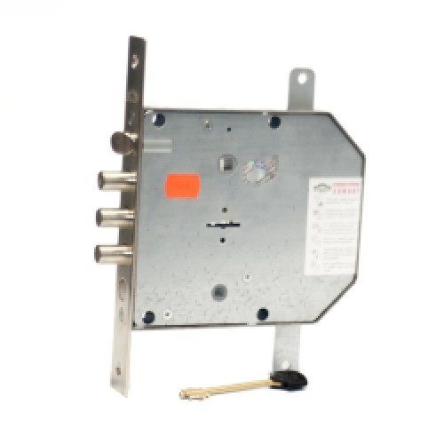 Врезной замок с защелкой и задвижкой, с выпусками под тяги. для дверей любого типа, толщина корпуса 20 мм. 4 класс. Три стальных цилиндрических стержня диаметром 14 мм, вылет 40 мм, 4-х ходовый сувальдный механизм секретности. Дополнительный одноходовый засов стальной стержень диаметром 14 мм, выход 21,2 мм, используется как задвижка, управляется ручкой-заверткой, расположенной с внутренней стороны двери. Универсальная защелка диаметром 16 мм: управляется фалевой ручкой. Скос защелки выполнен по радиусу, что обеспечивает комфортное захлопывание двери и меньший износ. В замке предусмотрены тяги, обеспечивающие 3-х точечное запирание от одного ключа. Ход тяг 20 мм. Защита от криминального и силового взлома, высверливания, выдавливания, перепиливания. Backset 68 мм. Межосевое расстояние ( от центра ручки до центра ключевой скважины ) 42 мм.