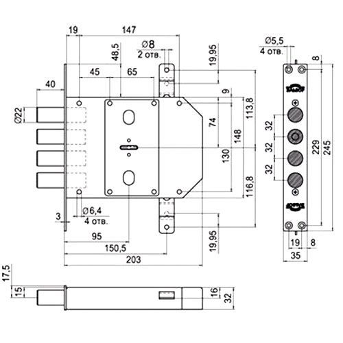 Диаметр стержней 22 мм. При полном вылете стержней на 40 мм, в корпусе замка остается 30 мм, что исключает возможность «изгиба» засова при попытке силового вскрытия двери.