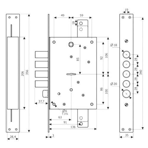 ЗВ 2112 Т - Замок врезной сувальдный под ручку, с выводами под тяги. Замок универсальный - переворот защелки выполняется без разбора замка (тип защелки - реверсивная). 3-й класс взломостойкости. Имеет 4 ригеля диаметром 18 мм (вылет ригеля 37,7 мм), съемную лицевую планку. Длина ключа 54 мм. Защита от наиболее распространенных методов вскрытия: защита от вскрытия отмычкой - ложные пазы на стойке и сувальдах, увеличенная жесткость пружин сувальд; защита от взлома – усиленная конструкция засова; защита от высверливания – закаленная стойка рейки хвостовика; защита от «свертыша» – ослабленный зуб рейки хвостовика. Предназначен для установки в металлические двери, шкафы и сейфы. Рекомендована комплектация с бронепластиной. Гарантия 5 лет.