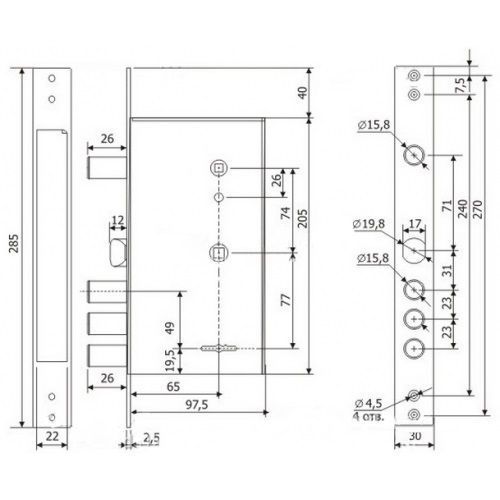 Замок врезной Guardian (Гардиан) сувальдный с задвижкой и защёлкой ЗВ 30.15, 4 кл. (длинный кл. 59 мм) /123:208:3/ - Замок врезной сувальдный под ручку, с задвижкой. Реверсивная защелка, переворот защелки осуществляется без разбора замка. 2-ой класс безопасности. Защита от наиболее распространенных методов вскрытия: защита от вскрытия отмычкой – ложные пазы на стойке и сувальдах, увеличенная жесткость пружин сувальд; защита от вандалов – отсутствует нижняя стенка корпуса замка; защита от «свертыша» – ослабленный зуб рейки хвостовика; защита от взлома – при полностью выдвинутых ригелях замка, 30% их длины остается в корпусе замка, усилена конструкция засовов; защита от высверливания – закаленная стойка рейки хвостовика засова. Замок предназначен для установки в металлические двери.