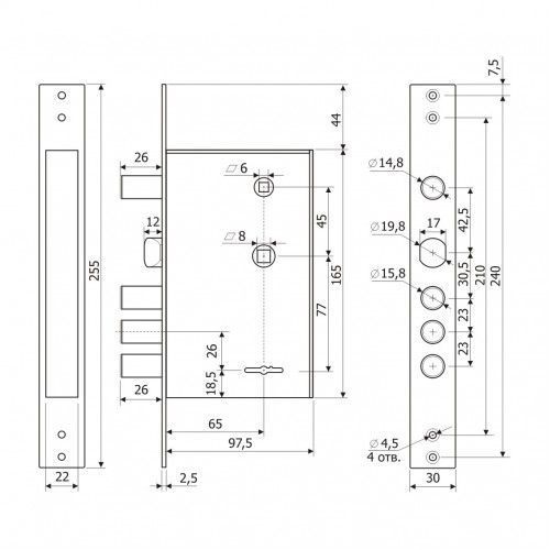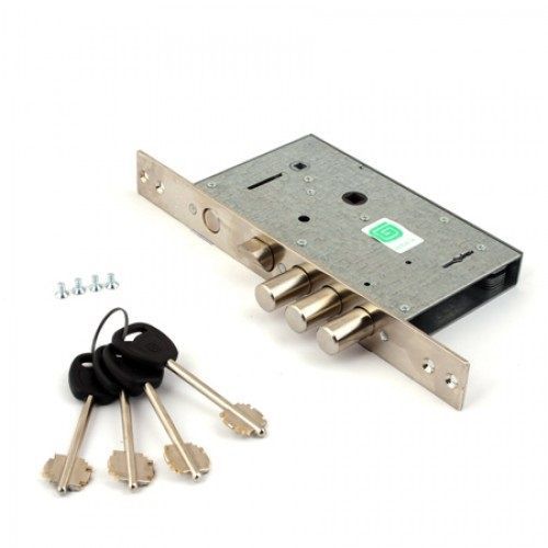 Замок врезной Guardian (Гардиан) сувальдный с задвижкой и защёлкой ЗВ 30.12, 4 кл. /123:107/ - Замок врезной сувальдный под ручку, с задвижкой. Реверсивная защелка, переворот защелки осуществляется без разбора замка. 2-ой класс безопасности. Защита от наиболее распространенных методов вскрытия: защита от вскрытия отмычкой – ложные пазы на стойке и сувальдах, увеличенная жесткость пружин сувальд; защита от вандалов – отсутствует нижняя стенка корпуса замка; защита от «свертыша» – ослабленный зуб рейки хвостовика; защита от взлома – при полностью выдвинутых ригелях замка, 30% их длины остается в корпусе замка, усилена конструкция засовов; защита от высверливания – закаленная стойка рейки хвостовика засова. Замок предназначен для установки в металлические двери.