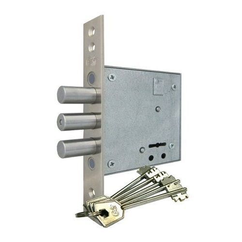 Лицевая планка замка сьемная , крепится по бокам корпуса на 4 болта ( по 2 с каждой стороны ) . Данная модель замка комплектуется лицевой планкой "КРИТ-М" либо "БУЛЬДОРС" . Планки идентичны по креплению к замку , но отличаются размером и расположением отверстий крепления к двери . У лицевой планки "КРИТ-М" отверсия расположены вертикально , а у планки "БУЛЬДОРС" горизонтально .