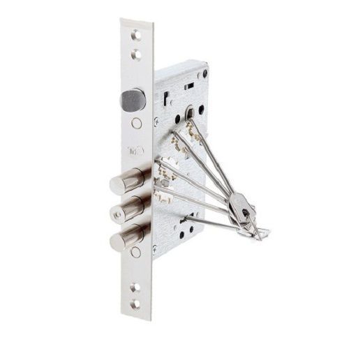Замок врезной сувальдный универсальный с тремя цилиндрическими ригелями диаметром 15,8 мм и защелкой класс 3 ГОСТ 5089-2011, предназначен для установки на левые и правые металлические двери, как внутреннего, так и наружного открывания.
