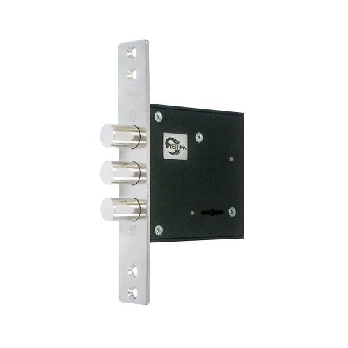 Замок имеет одно направление запирания — тремя стальными ригелями диаметром 16 мм, которые выдвигаются из корпуса замка на 22 мм. Замок запирает дверь на два полных полуоборота.