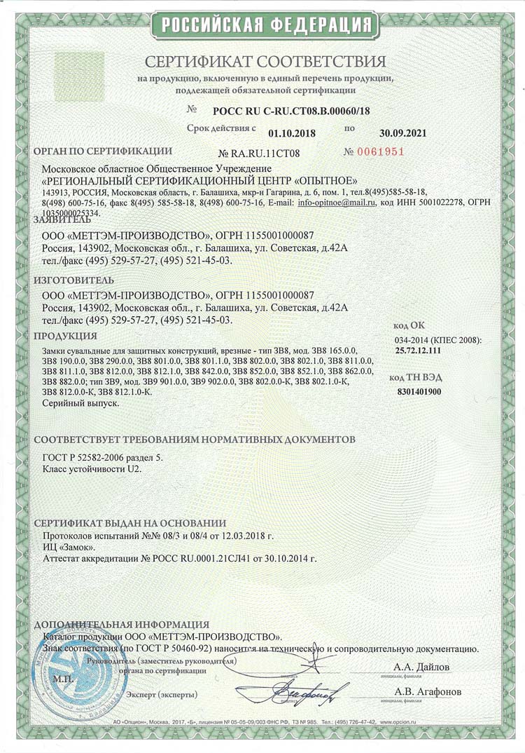 Замок не имеет защёлки, поэтому рекомендуется к применению в качестве второго запирающего устройства.
