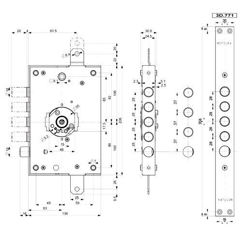 Уникальный запатентованный замок серии 3D KEY для стальных дверей обеспечивает максимальную безопасность. Съемное нуклео заменяется в случае потери ключа для обеспечения полной безопасности. Шестигранный ключ имеет три кодовые поверхности и две десмодромные дорожки, кодировочные пины выполнены из закаленной стали. 10 миллиардов возможных кодовых комбинаций. Изготовление дубликатов возможно только на фабрике Mottura. Модель замка 3D.771 S подходит для дверей левого открывания. Совместим по размерам и точкам крепления с основными замками для стальных дверей. С планкой в комплекте.