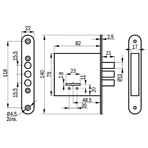 Замок врезной Sam (Сам) сувальдный ЗВ8-4С/15 (без отв. планки), 5 кл. 4-х сувальдный, рекомендован для установки в двери толщиной 40-50 мм на период ремонта или строительства для дверей в помещениях с невысокими требованиями к охранным свойствам. Замок универсальный, возможна установка как в правые, так и в левые двери. В комплекте: шестигранные накладки (цинковое покрытие), 5 стальных ключей длиной 70 мм. Ответная планка в комплект не входит. Замок открывается и закрывается изнутри и снаружи ключом. Засов из трех штырей круглого сечения. Покрытие корпуса — цинковое. Покрытие лицевой и ответной планок — цинковое. Замок имеет защиту от высверливания, защиту от отмычек. Изготовлен из высокопрочных материалов. Имеет защитное покрытие. Количество секретных комбинаций - 500. Вылет ригелей — 21 мм, диаметр ригеля — 11 мм. Бэксет: 48,5 мм.