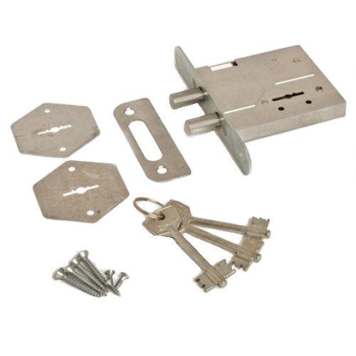 Замок врезной 4-х сувальдный ЗВ8-4С/13 рекомендован для установки в двери толщиной 40-50 мм на период ремонта или строительства для дверей в помещениях с невысокими требованиями к охранным свойствам. Замок универсальный, возможна установка как в правые, так и в левые двери. В комплекте: шестигранные накладки (цинковое покрытие), 3 стальных ключа длиной 70 мм. Замок открывается и закрывается изнутри и снаружи ключом. Засов из двух штырей круглого сечения. Покрытие корпуса — цинковое. Покрытие лицевой и ответной планок — цинковое. Замок имеет защиту от высверливания, защиту от отмычек. Изготовлен из высокопрочных материалов. Имеет защитное покрытие. Количество секретных комбинаций - 500. Вылет ригелей — 21 мм, диаметр ригеля — 11 мм. Бэксет: 48,5 мм.