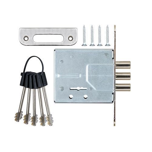 Замок врезной Sam (Сам) сувальдный ЗВ8-8У/15, 5 кл. /79600/ предназначен для установки в деревянные и металлические двери толщиной 40-50 мм, а также в металлические шкафы. Замок универсальный, возможна установка как в правые, так и в левые двери. В комплекте: круглые накладки «медный антик», 5 стальных ключей длиной 70 мм, ответная планка. Замок открывается и закрывается изнутри и снаружи ключом. Выпускается с засовом из трех ригелей круглого сечения. Покрытие корпуса — цинковое. Покрытие лицевой планки — никелевое. Замок имеет защиту от высверливания, защиту от отмычек. Изготовлен из высокопрочных материалов. Имеет защитное покрытие. Количество секретных комбинаций - 250 000. Вылет ригелей — 21 мм, диаметр ригелей — 11 мм. Бэксет - 48,5 мм.