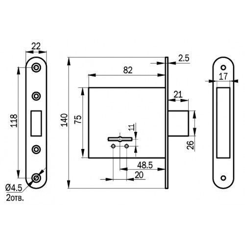 Замок врезной 8-сувальдный. Предназначен для установки в деревянные и металлические двери толщиной 40-50 мм, а также в металлические шкафы. Замок универсальный, возможна установка как в правые, так и в левые двери.