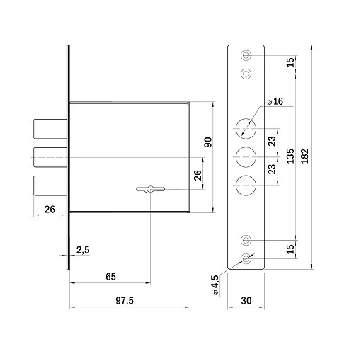 Замок врезной сувальдный Punto MDV30S с тремя ригелями предназначен для установки во входные и технические металлические двери. Стальной оцинкованный корпус. Универсальная установка, подходит для левых и правых дверей. Бэксет- 65 мм. Выход ригелей- 26 мм. Диаметр ригелей -16 мм. В комплект входят: врезной замок, 5 ключей с эргономичной пластиковой головкой для дверей толщиной 40-120мм, крепежная фурнитура.